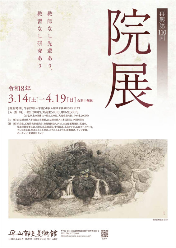 日本美術院による日本画の公募展である再興院展が全国を巡回するうちのひとつとなる本展では、同人作家・招待作家の作品と各賞受賞作品に加え、入選作品より広島に縁のある作家の作品を選んで展覧し、日本画壇の最新のトレンドとともに底流する日本画のこころを紹介します。